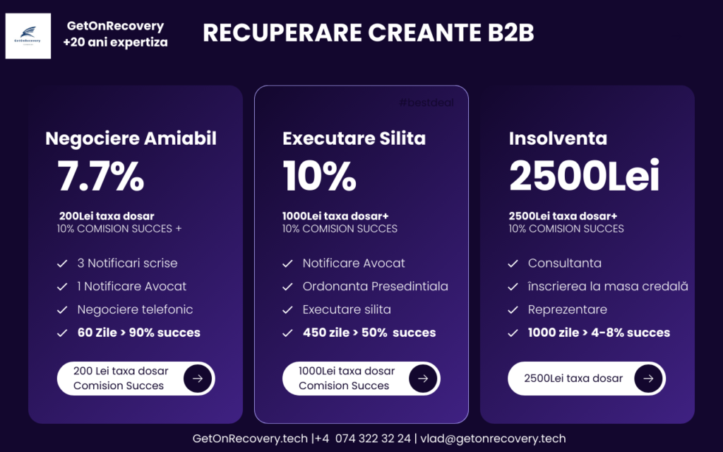 Negociere amiabila: sms, email, scrisori, contact telefonic. Ofiteri de colectare specializati B2B.